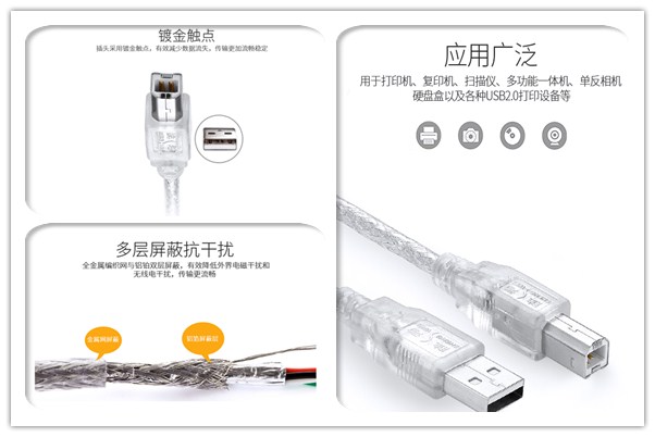 UC-1050 USB2.0打印機連接線,此類產(chǎn)品之所以能夠受到客戶的青睞,主要是因為它采用高純度鍍錫無氧銅,信號強勁,速度穩(wěn)定提升。USB2.0傳輸速度高達480Mbps。而且它的插頭還采用了鍍金觸點,有效減少數(shù)據(jù)流失,傳輸更加流暢穩(wěn)定。