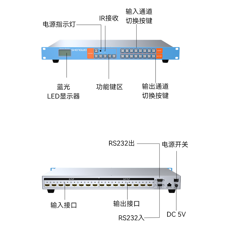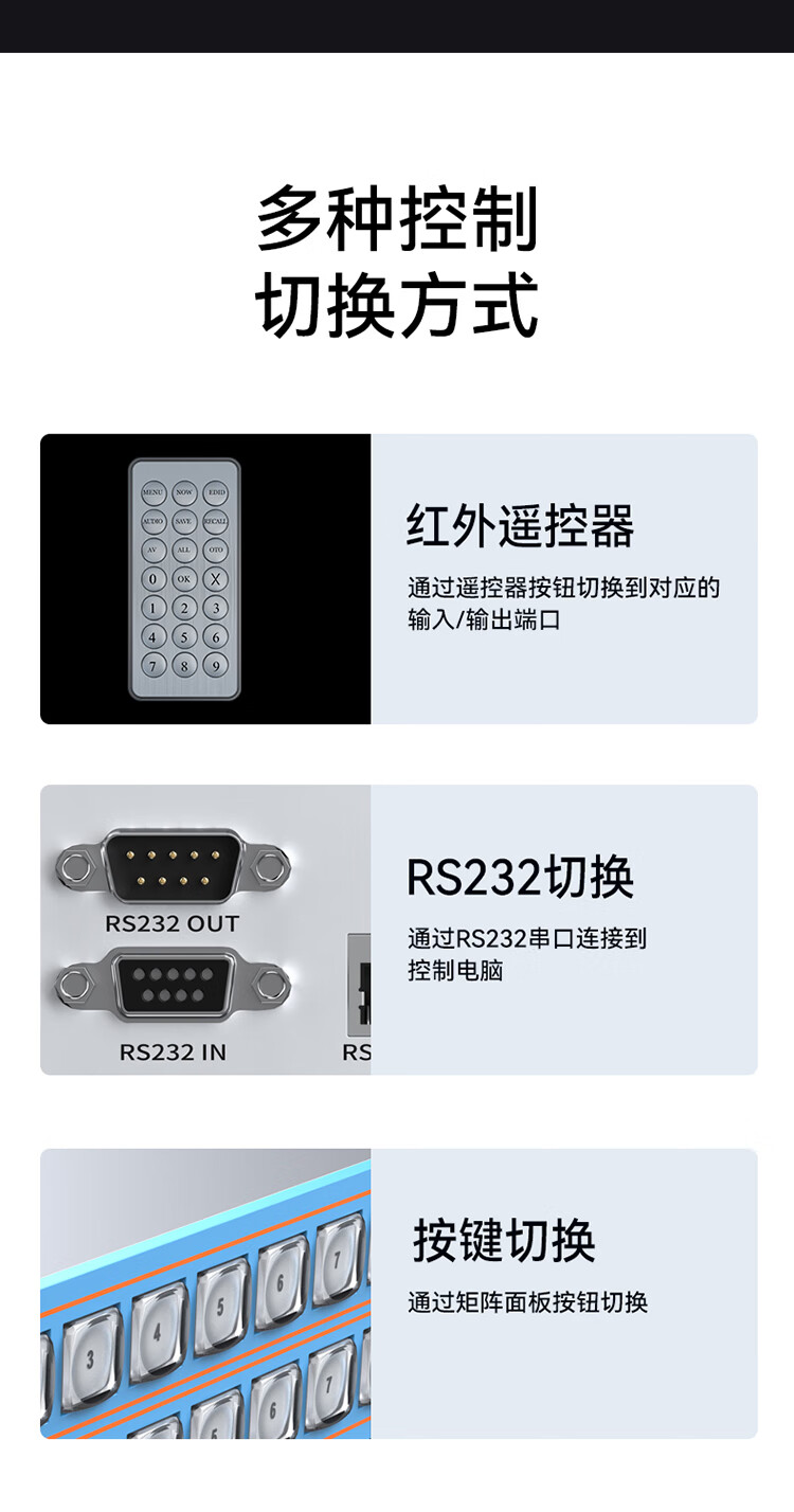 控制方式:按鍵、RS232、紅外遙控、上位機軟件