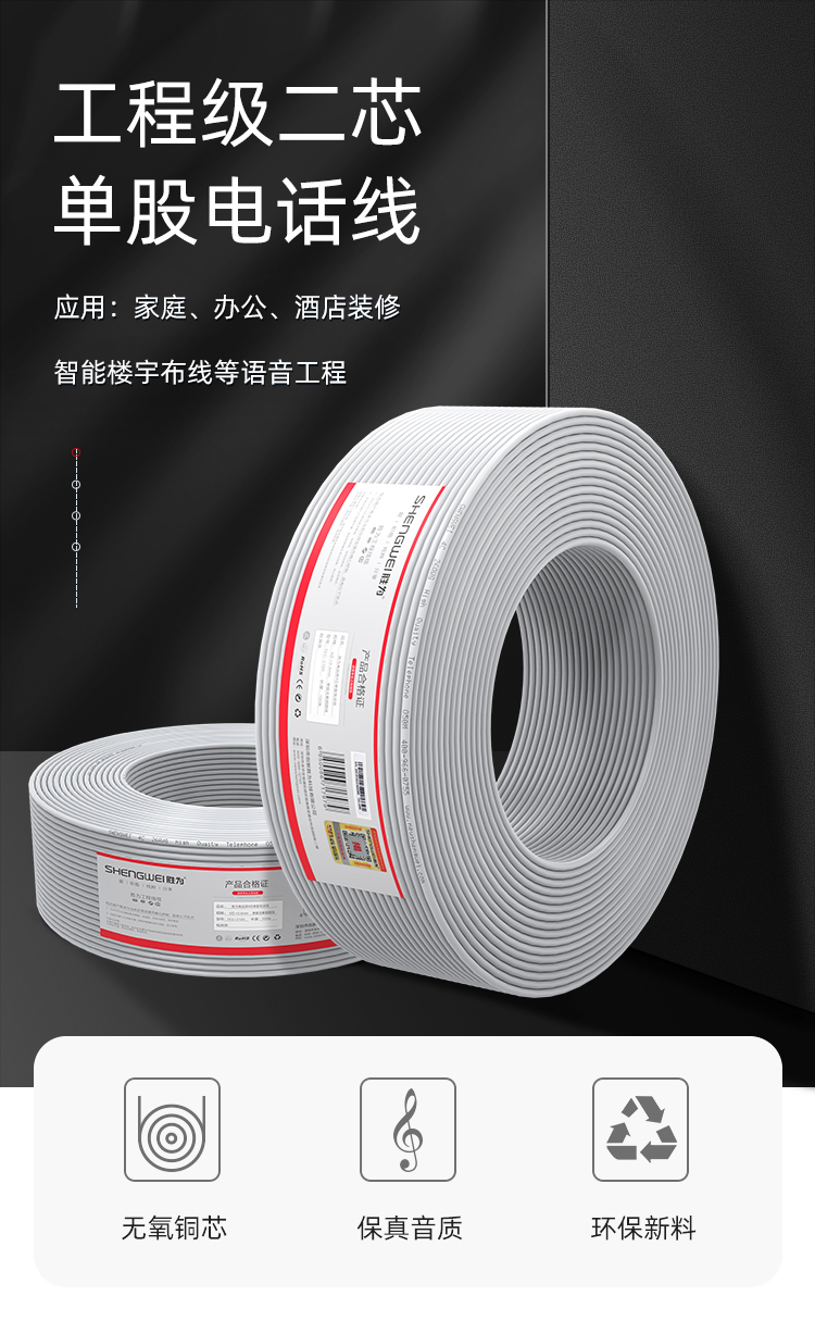 電話線 2芯單股無氧銅 勝為0.4mm座機(jī)/傳真機(jī)電話線100米 TEC-1100